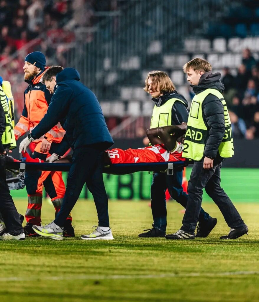 Sorti sur blessure lors d’un match de UEFA Europa Conference League face au Sigma Olomouc, l’attaquant congolais souffre d’une fracture du tibia et du péroné gauches.